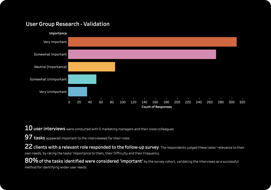 Based on this research I compiled and presented an internal report identifying clients’ least-met needs, introducing high-level design principles and making robust data-driven feature recommendations.